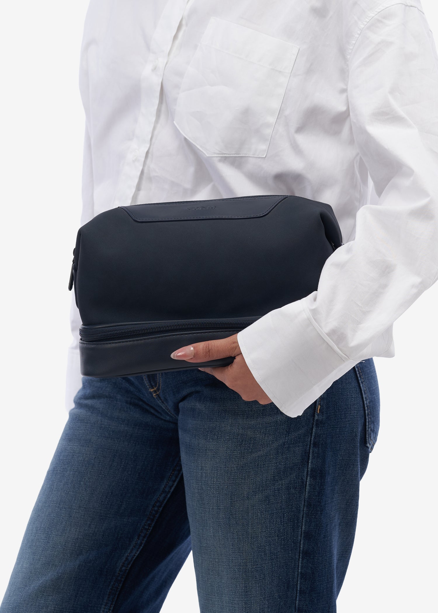 The durable zipper closure and sleek handle ensure easy portability, making it a perfect companion for both short getaways and extended journeys. Whether for daily use or travel, the Aqua Suede Wash Bag adds a touch of sophistication to your routine.